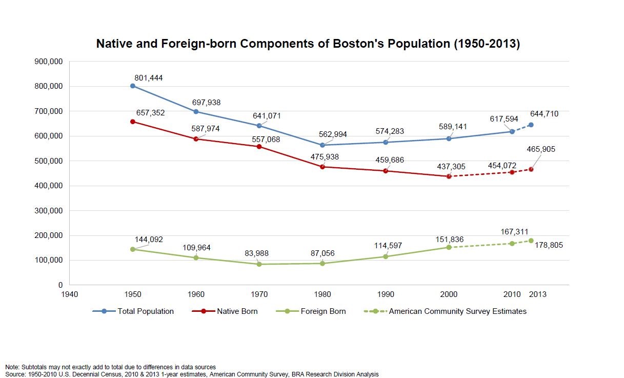 We’re an increasingly diverse city. Between 1980 and 2013, the foreign-born population accounted for virtually all of Boston’s population growth.