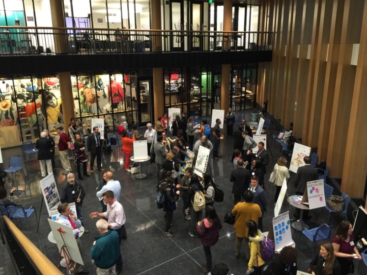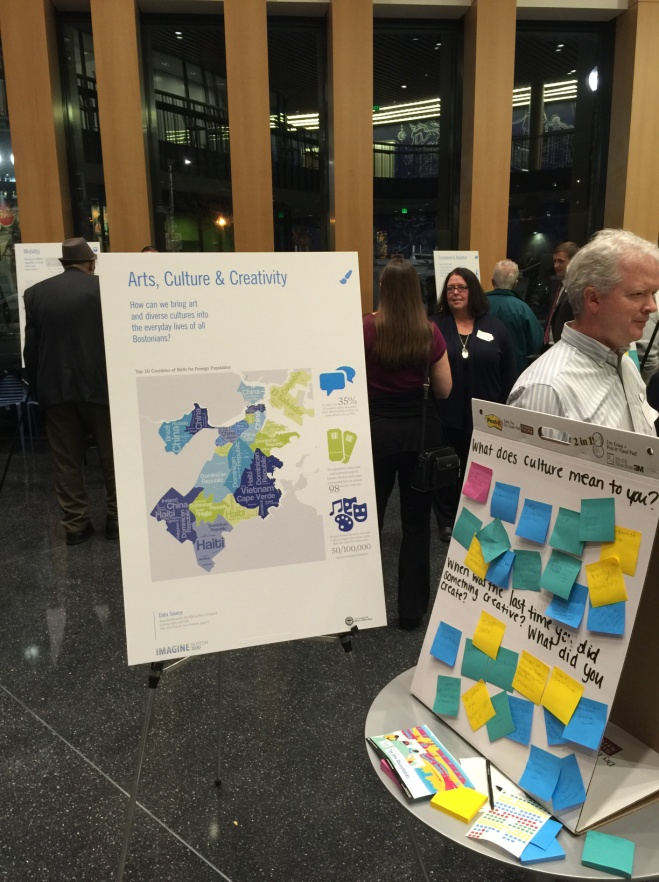 At left, people browse information on posters that displayed facts about the city based on the themes of Imagine Boston 2030. At right, a poster on arts, culture, and creativity asks participants for ideas about sharing cultural resources across Boston’s diverse neighborhoods.