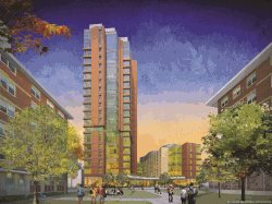 , a dormitory project that was envisioned in the school’s 2012 Institutional Master Plan and will replace the existing 220-bed Julie Hall. Once complete, the 19-story building will contain a total of 691 beds, a café serving prepared foods, and ground floor space for a variety of student life and academic uses. Function space will be available on the top floor. There will also be 102 covered bicycle spaces and 15 underground parking spaces.