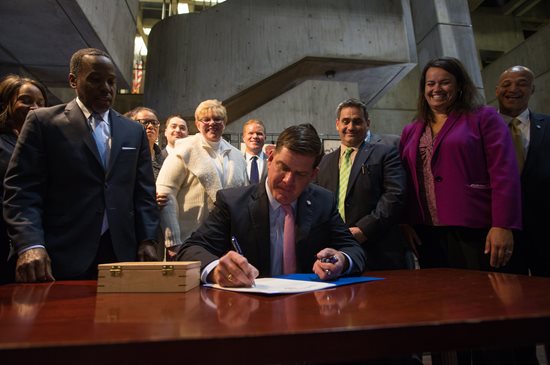Surrounded by local business owners, elected officials, and other leaders, Mayor Martin J. Walsh signs Executive Order to expand opportunities for women and minority owned businesses at City Hall ceremony.