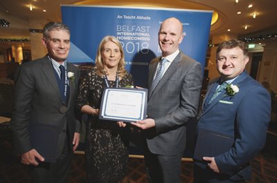 At the Belfast International Homecoming are (L-R) Belfast Ambassador Medal winners Brian Golden, Caitriona Lavery and Conor Hawkins with Joe O’Neill from sponsors Belfast Harbour.