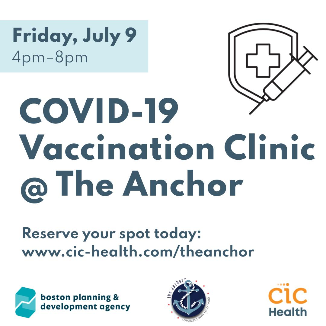 The Boston Planning & Development Agency is partnering with The Anchor and CIC Health to bring you a vaccine clinic on July 9, 2021. The clinic is for those aged 12 and older. It will run from 4 P.M. to 8 P.M.