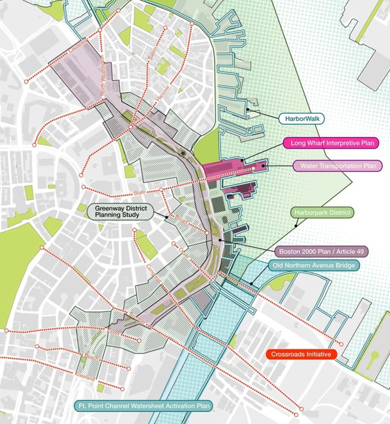 A Municipal Harbor Planning process was initiated in 2013 to harmonize the Greenway Guideline’s recommendations with the state’s Waterways Regulations and leverage new growth spurred by the removal of the elevated artery and Harbor cleanup to improve dated public infrastructure and enhance public use of the waterfront. The resulting Municipal Harbor Plan and Watersheet Activation Plan developed flexible dimensional standards for the Harbor Garage and Hook Wharf sites, and improvements to the public realm and waterfront to be delivered along with the redevelopment of the properties. The Harbor Plan provides over an acre of new open space, including a new park and Harbor Islands Gateway at Long Wharf, additions to Harborwalk, funding to support activation of the Fort Point Channel, and support of the New England Aquarium’s Blueway Vision.