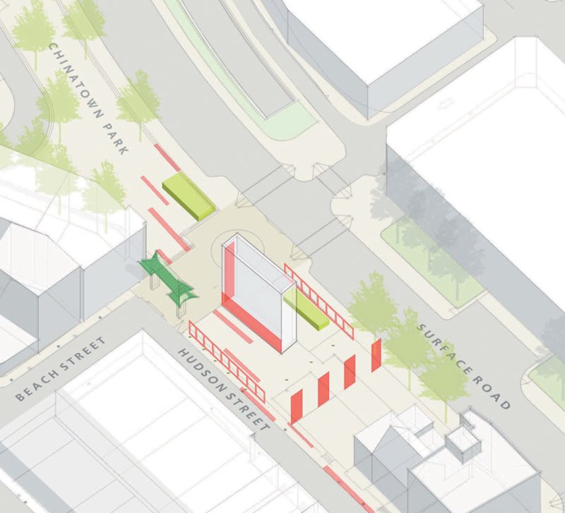 The design area will address the area of Mary Soo Hoo Park (formerly known as Chinatown Gateway Park) and its immediate context—the MassDOT vent tower, the area of Chinatown Park that lies south of the Beach Street corridor (east of the vent tower), and will consider temporary use of a privately-owned parcel immediately to the south of Mary Soo Hoo Park, owned by the Lee Family.
