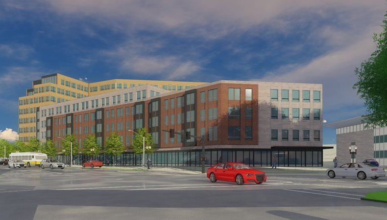 The 135 Dudley Street mixed-use residential/commercial project is adjacent to the B-2 Police Station, the Roxbury Municipal Court and the Dudley Literacy Center, with a total of 282,382 gross square feet (gsf) of floor area in two buildings of nine and four floors including 168 multi-family units (108 condos and 60 rentals); 8,703 gsf of commercial space; and 146 garage parking spaces including 25 spaces open to the public.