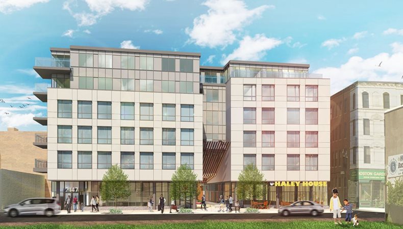 The Proposed Project consist of the new construction of a new apartment building measuring approximately 99,602 gross square feet containing approximately 74 units. The first floor will include approximately 2,500 square foot new cafe/restaurant space for the Haley House Bakery Café, a community-oriented retail space, individual artist work studios, shared workspace, a common/public courtyard and indoor bike storage racks (one per unit). Floors 2-5 will contain 62 affordable rental housing units marketed to artists and individuals engaged in the creative economy. The sixth floor will include 12 for-sale condominium units –4 affordable at 70% AMI, 4 at 100% AMI and 4 at market rate. The current program includes a unit mix of 8 studios, 32 one-bedrooms, 29 two-bedrooms and 5 three-bedrooms, along with a leasing office. A community space will be included on the second floor and the roof will contain solar panels. The project will have one-level of below-grade parking containing approximately 31 parking spaces.