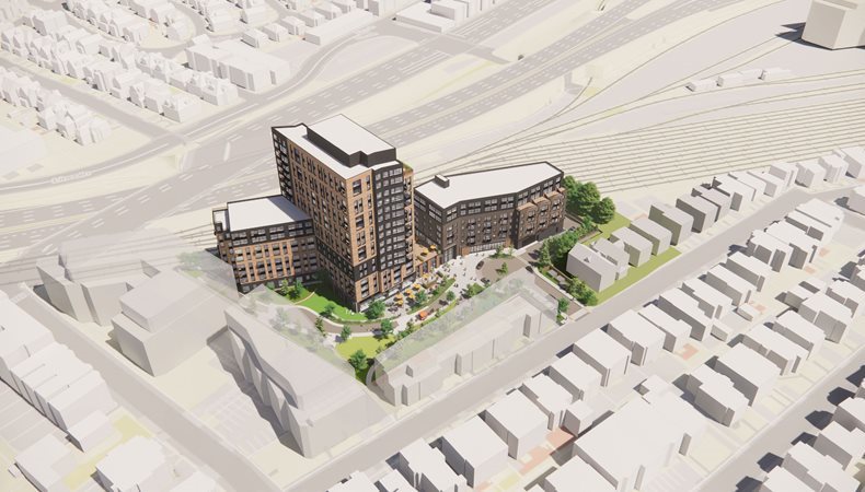The proposed Project includes the demolition of the existing structures and construction of a multifamily building including approximately 316 units with a mix of unit sizes ranging from studios to three-bedroom apartments. The Project’s proposed building includes varied heights and massing, ground floor activated uses, landscaped open space, accessory parking, and amenities and services for building residents.