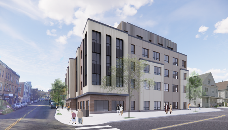 The Proposed Project is a new five-story​ elevator building with 51 income- and age-restricted rental housing units. The​ building will be 48,340 gross square feet. The flat-style units will be age-restricted to households 62​ years old and older. There will be 4 studio units and 47 one-bedroom units. The building will include​ covered parking for 5 vehicles. Additional​ amenities will include a common room, terrace, landscaped courtyard, leasing office, management​ office, mail and package room, fitness center, and individual meeting rooms.
