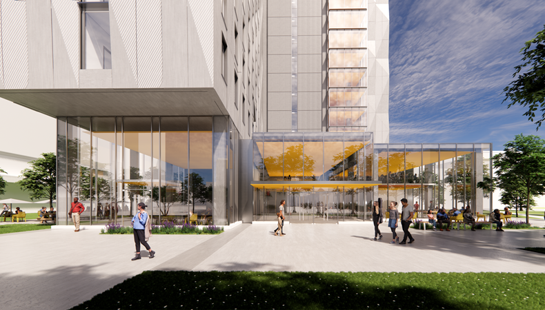 The Project will consist of approximately 202,000 SF of GFA, 18-story (measuring approximately 210 feet in height to the top of the last occupiable floor) student residence hall containing approximately 972 student beds along with approximately three Community Director apartments, student support spaces, a ground floor bicycle room, and dining, wellness and gathering spaces.