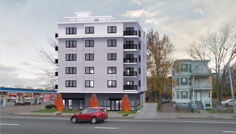 A six (6) story, twenty-nine (29) unit mixed-use building with a common roof deck and five (5) parking spaces, thirty-six (36) bicycle parking spaces, and retail space on the ground level.