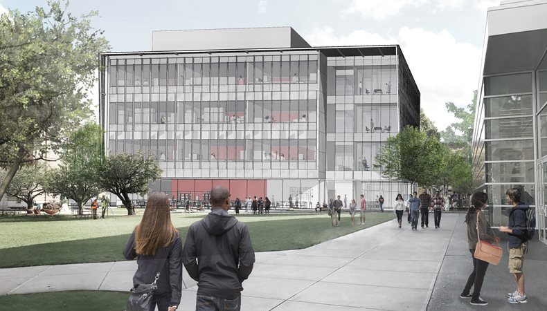The MpA Building will contain laboratories, student learning and group meeting space, offices, and support/storage space on floors two through four, and a first-floor maker space, manufacturing, and gathering space.