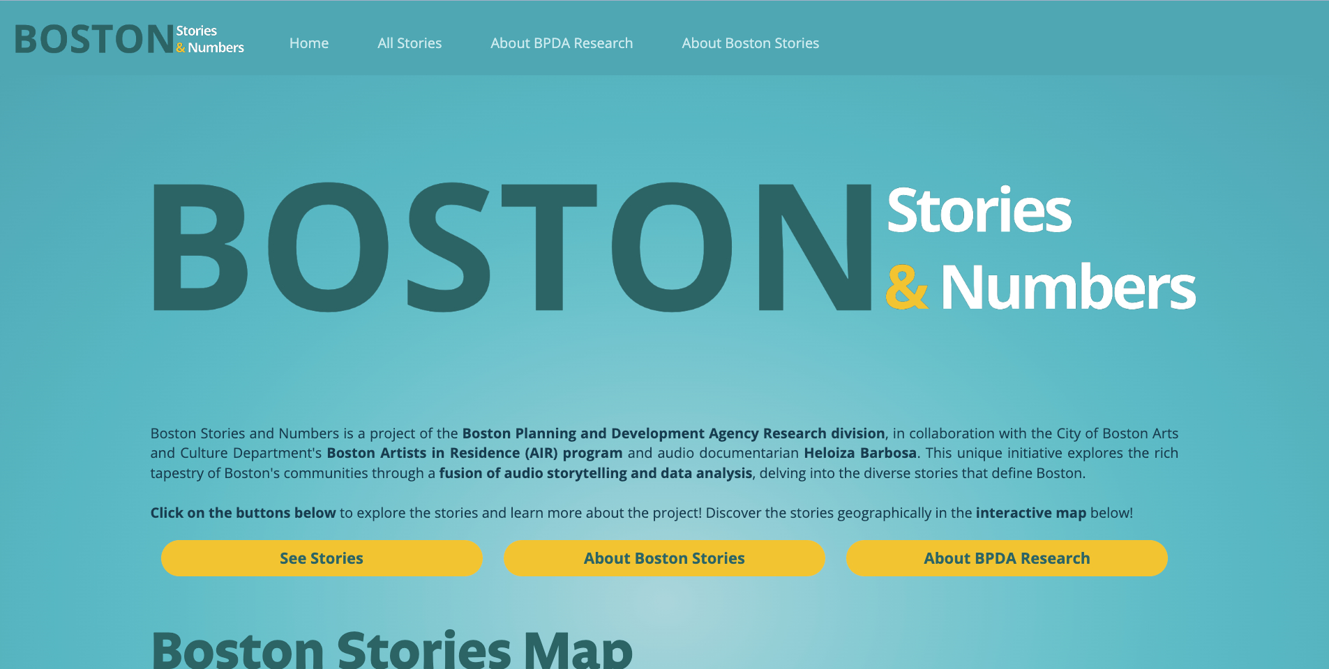 Welcome to Boston Stories and Numbers! This interactive website explores the stories and demographics of Boston's diverse residents. Boston Stories and Numbers is a collaboration between the Research Division, the Department of Arts and Culture's Boston Artists in Residence program, and audio documentarian Heloiza Barbosa.