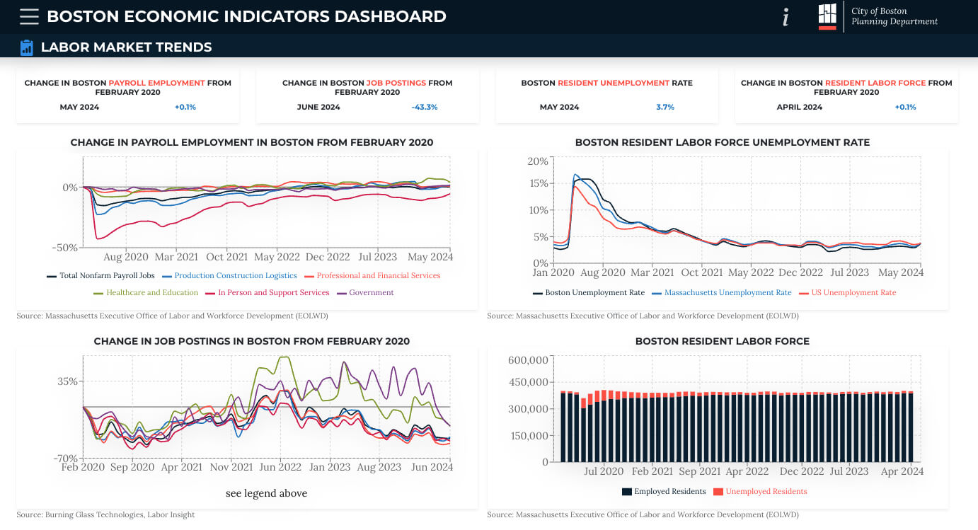 This Economic Indicators Dashboard is a joint project of the Research Division and the GIS Lab. It provides monthly data updates to track Boston’s economy in five areas: Labor Market, Mobility, Economic Activity, Real Estate Market, and Real Estate Development. In addition to citywide data for each of these five topic areas, the dashboard provides profiles of each of Boston’s four commercial hubs: Fenway/Longwood, Back Bay, Downtown, and South Boston Waterfront.