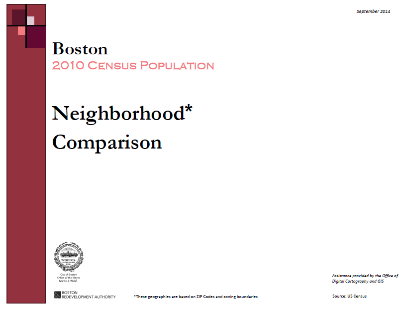 This publication compares Boston and its neighborhoods to the U.S. and Massachusetts on several demographic, economic and housing characteristics. This report uses a combination of 2010 Census data and 2009-2013 American Community Survey data.