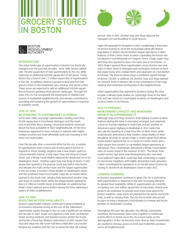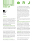 This publication discusses current and future grocery stores in Boston. It includes details on square footage, replacements, and expansions of grocery stores, as well as a map with all current supermarkets in Boston. The data in this report is a combination of 2011 City of Boston Assessing Department and 2012 InfoUSA data. This report has been revised to use the boundaries for the West End and Downtown that went into effect in 2014. See the revised report using the new boundaries