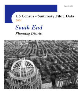 | The following reports feature selected data collected on all people and households in the 2010 Census and are from the 2010 Census Summary Files (SF-1).Population information included these reports are sex, age, race, Hispanic or Latino origin, household and family characteristics, and group quarters population. Housing items include whether a housing unit is owner-occupied or renter-occupied, as well as occupancy and vacancy status. This report is a profile of South End.