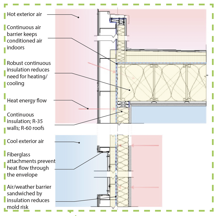 The project has used the LEED v4 Multifamily Midrise rating system and would earn 73.5 points for LEED Gold, will be all an electric building, includes installation of a 90kW solar PV system, and has a modeled 2035 Carbon Emission Intensity (2035 pCEI) of 1.04kg CO2e / sf-yr and, with the solar PV system, a modeled 2035 pCEI of 0.8 kg CO2e / sf-yr. Energy efficiency strategies include passive house enclosure, high efficiency ERVs paired with air source heat pumps take advantage of existing energy in the air to control interior air and domestic water temperatures contribute to 75% reduction in energy use from code baseline. Habitable landscaped garage roof mitigates heat island effect, producing an oasis of cooled area on a southern exposure.