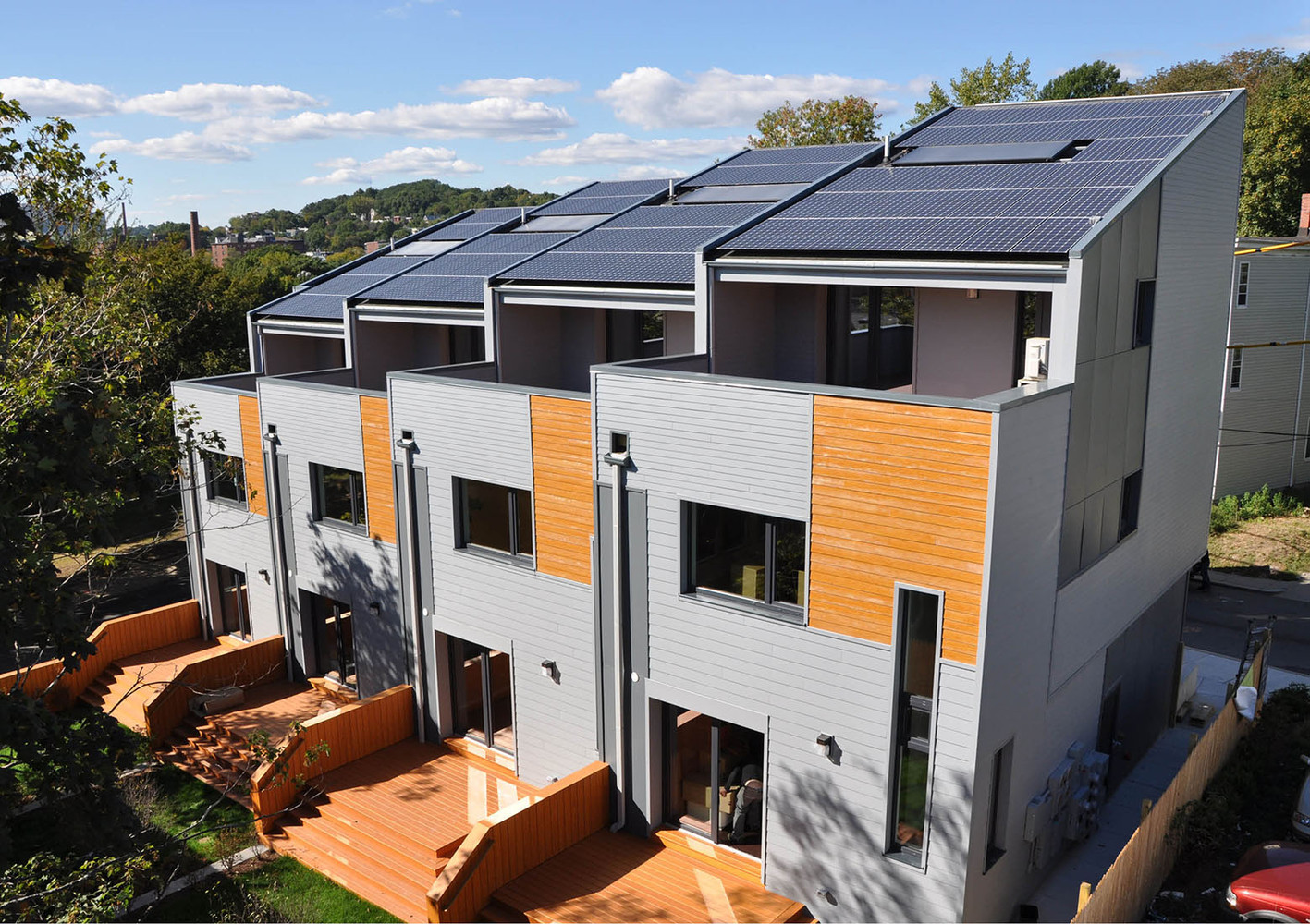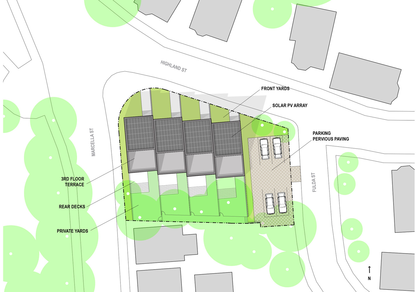 The project is certified LEED for Homes Platinum with 90.5 points and has achieved HERS ratings between -6 and -9 across all four homes. The project utilizes high efficiency Heat Recovery Ventilator for air exchange and ductless mini split systems to provide heating and cooling. Hard surface flooring, cleanable walk-off mats, and areas to promote shoe removal beside the entryway all seek to create an environment with fewer respiratory irritants. Interior finishes feature low VOC paints and FSC certified cabinetry. The building envelopes are designed to be thermally robust; double-stud wall construction, high insulation levels, prevention of air infiltration at seams and transitions, and the installation of triple-glazed high performance windows all help to reduce heating and cooling energy use. All appliances are Energy Star rated.