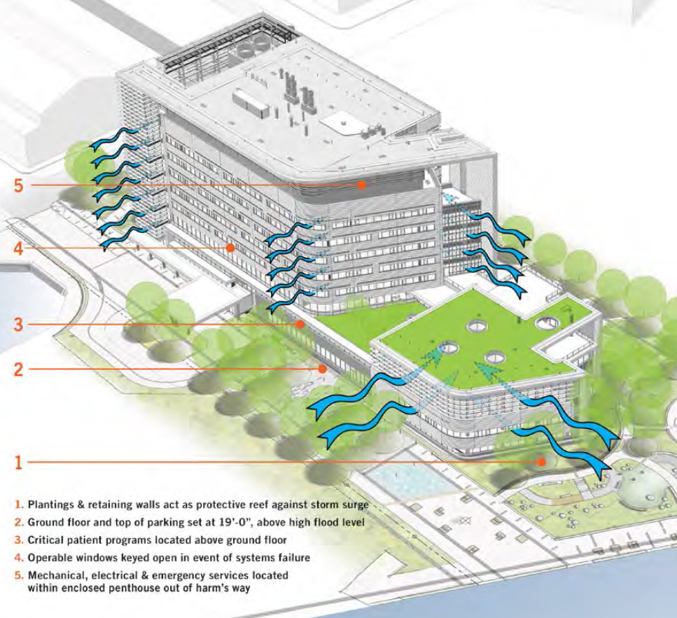 Spaulding Rehabilitation Hospital elevated its first floor as high as possible to prevent against projected sea-level rise; 42” above the current 100-year flood line and 30” above the 500-year flood line. The building achieved LEED V2 BD+C Gold Certification with 44 points out of 69. The highly energy-conserving building envelope, natural daylighting, gas-fired cogeneration system, and other features combine to keep the carbon emissions of the building far below those of most hospitals.