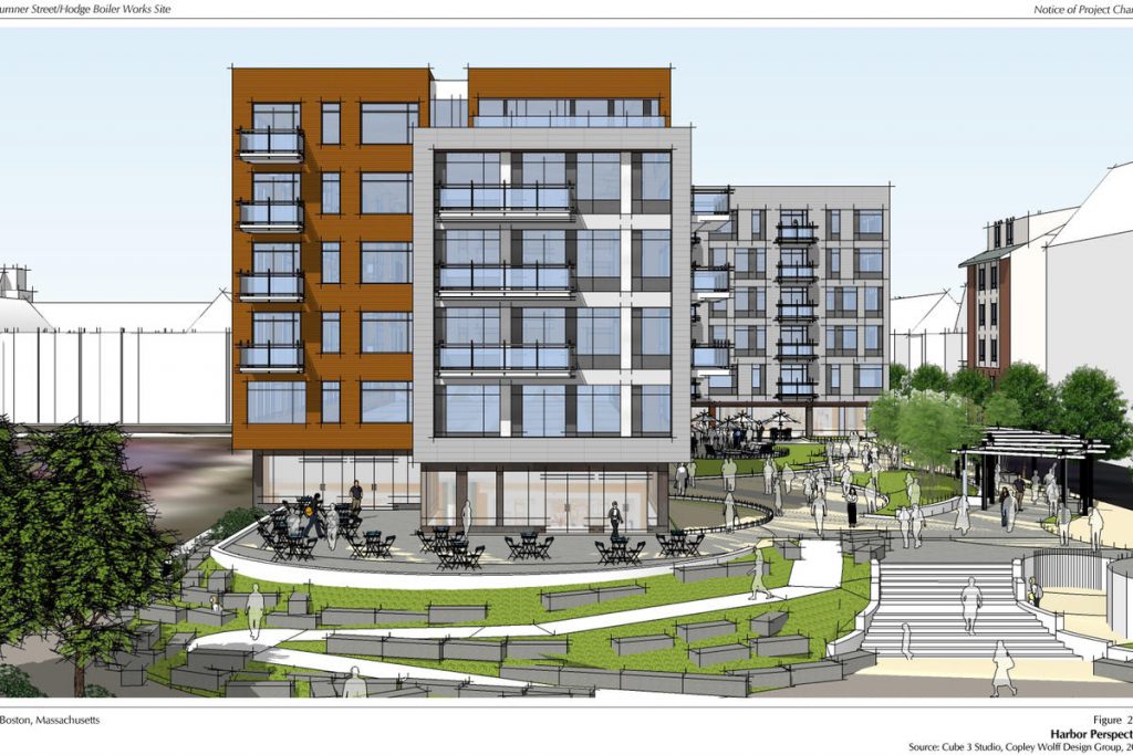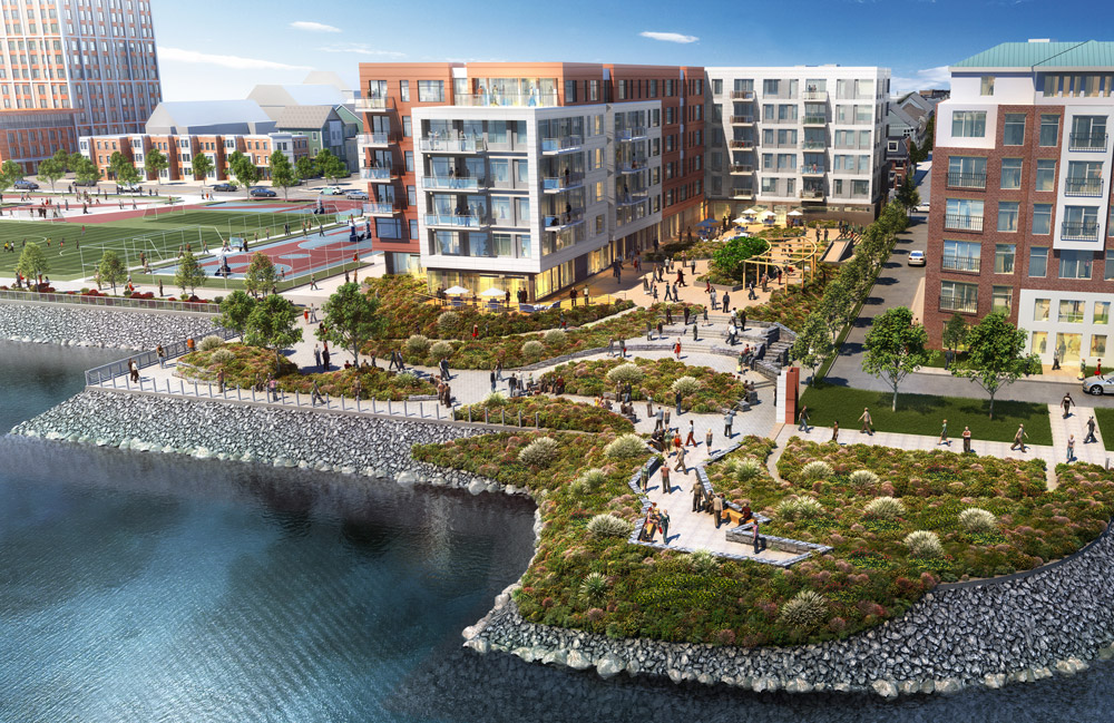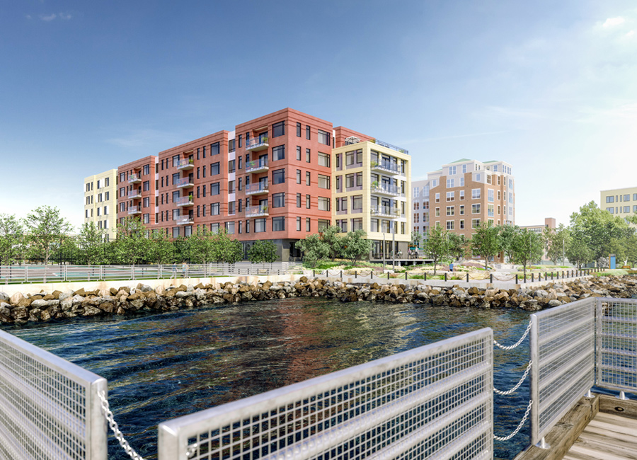 The ground floor of the building will be constructed at elevation 19.5’ (BCB), elevating the building to the future Sea Level Rise Base Flood Elevation. To further resist sea level rise and reduce flood risk, an elevated sheet pile bulkhead shoreline stabilization structure has been designed for the project. The building will achieve LEED v4 for BD+C, New Construction and Major Renovation silver certification with 55 points. Efficient heating and cooling systems, light colored reflective roofing material, water reduction strategies, and electric car charging stations are some of the many integrated sustainable features. The project transforms a vacant urban waterfront site, currently inaccessible to the public, into a mixed-use development with multiple public amenities. A 15’ wide walkway along the waterfront completes the East Boston Harborwalk, connecting the 240’ linear gap remaining between The Eddy and Piers Park.